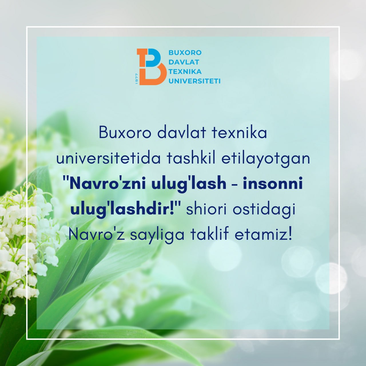 Sizlarni Buxoro davlat texnika universitetida tashkil etilayotgan "Navro'zni ulug'lash - insonni ulug'lashdir!" shiori ostidagi Navro'z sayliga taklif etamiz.