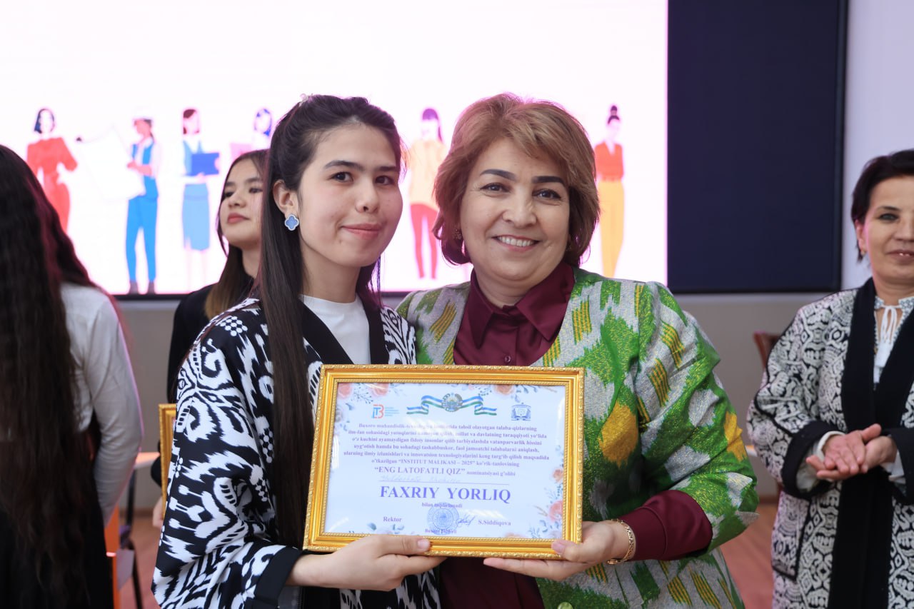 Yakuniy natijalarga ko’ra, “Institut malikasi-2025” tanlovida faxrli 1-o‘rinni kimyoviy va oziq-ovqat texnologiyalari fakulteti talabasi Aziza Hasanova egalladi.