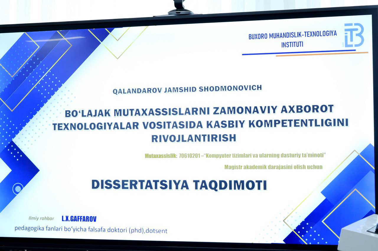 Buxoro muhandislik-texnologiya instituti “Menejment” (tarmoqlar va sohalar bo‘yicha) hamda Kompyuter tizimlari va ularning dasturiy ta’minoti magistratura mutaxassisliklari bo‘yicha magistrlarning dissertatsiya himoyasi muvaffaqiyatli o‘tkazildi.