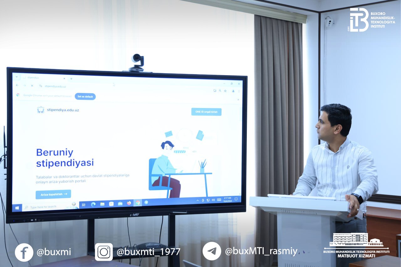 Shuningdek, hujjatlarni stipendiya.edu.uz elektron tizimiga yuklash jarayoni haqida ma’lumotlar berildi.