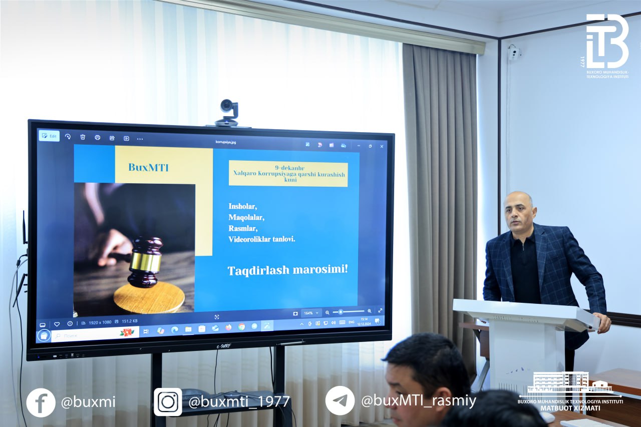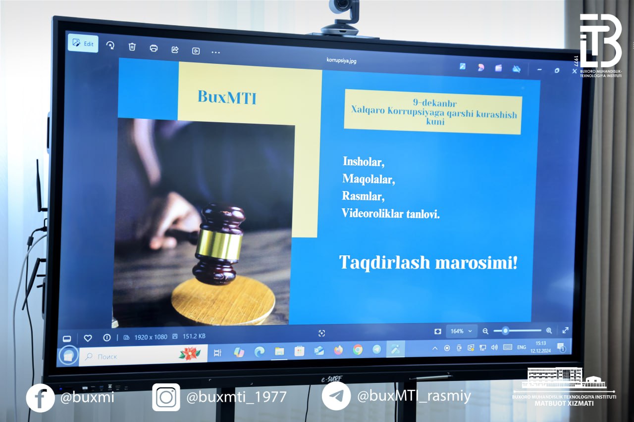 “9-dekabr — Xalqaro korrupsiyaga qarshi kurashish kuni” munosabati bilan “Аksilkorrupsiya oyligi” doirasida talaba-yoshlar o‘rtasida o‘tkazilgan tanlov g‘oliblarining taqdirlash marosimi bo’lib o’tdi.