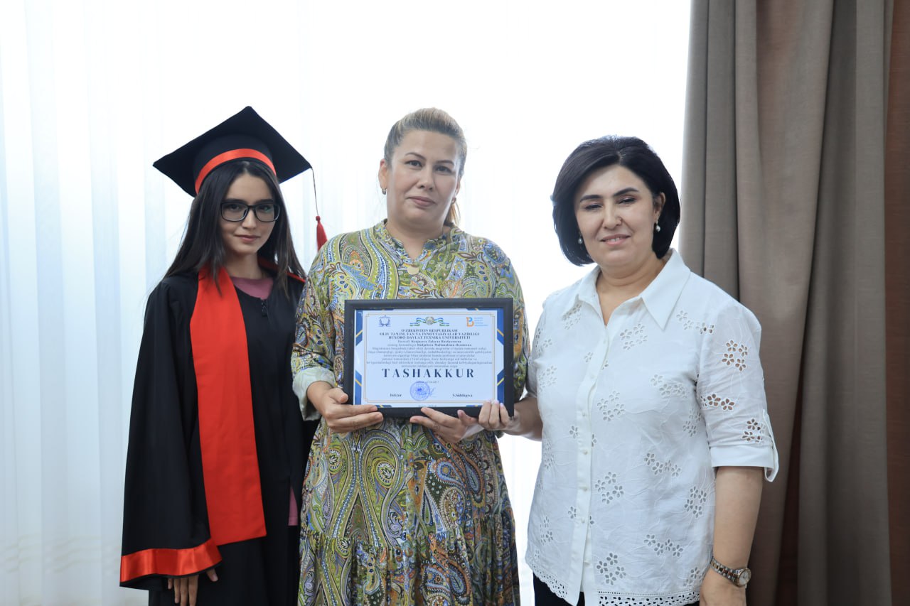 Buxoro davlat texnika universitetida magistrlarining diplom topshirish marosimi bo‘lib o‘tdi. Unda universitet rektori Sadoqat Siddiqova, bitiruvchi talabalar hamda ularning ota-onalari ishtirok etdi.