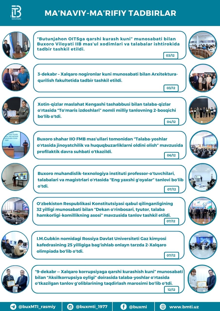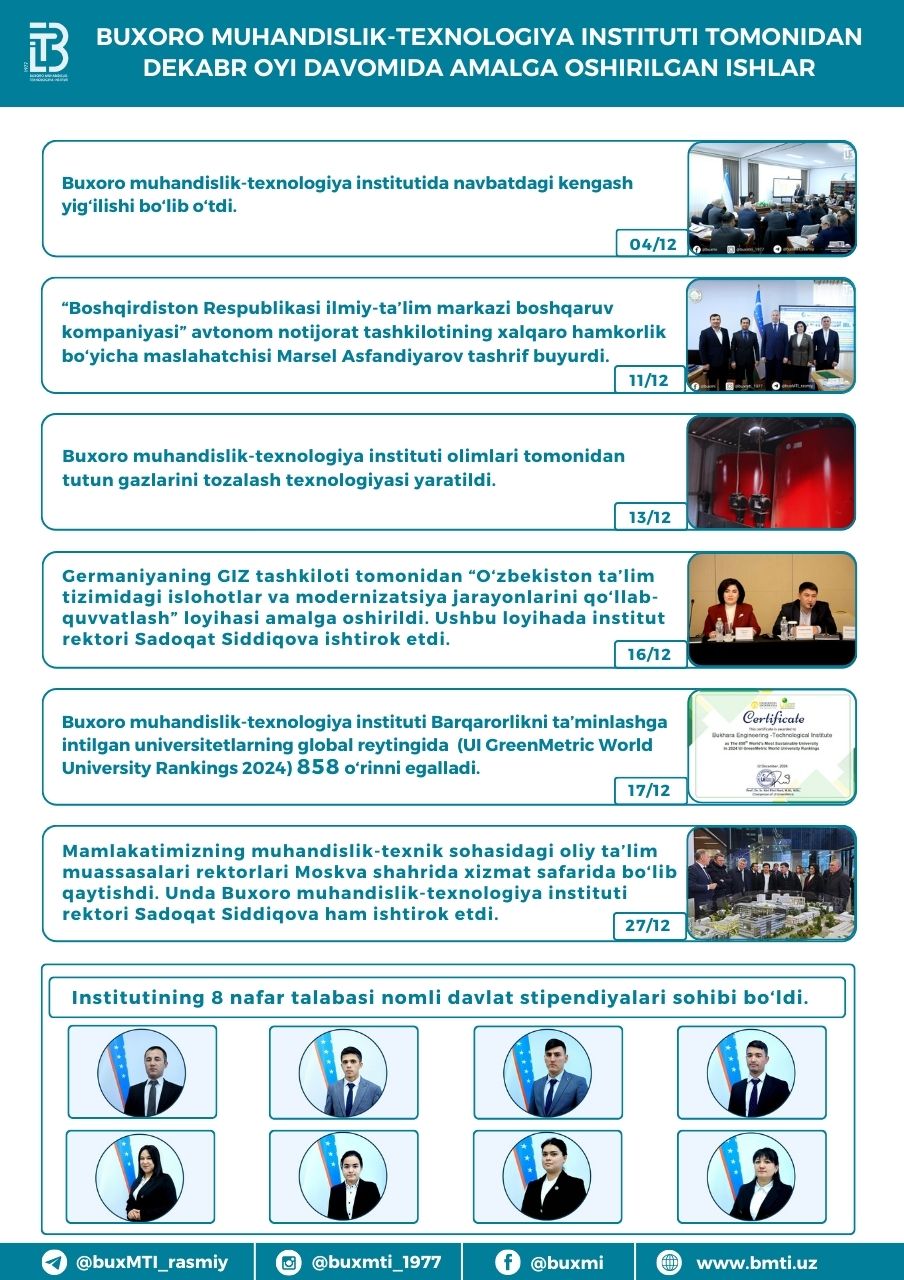 Buxoro muhandislik-texnologiya instituti tomonidan 2024-yil dekabr oyi davomida amalga oshirilgan ishlar