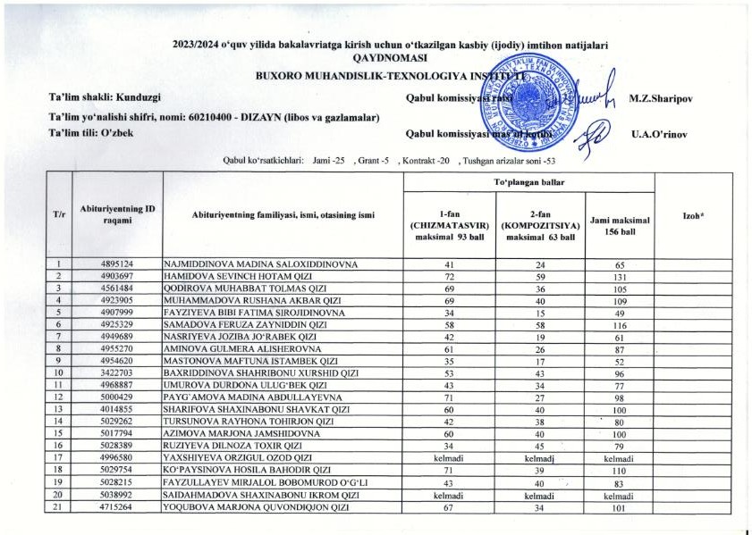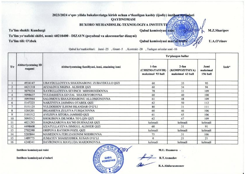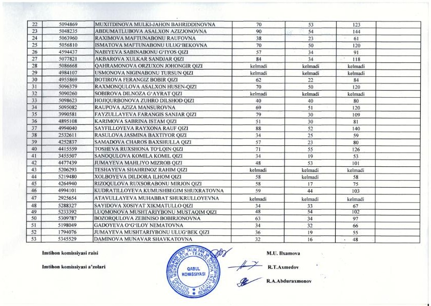 2024-YIL II CHORAK UCHUN OLIY TA’LIMDAN KEYINGI TA’LIM INSTITUTI MUSTAQIL IZLANUVCHILIKKA HUJJAT TOPSHIRGAN TALABGORLAR RO‘YXATI