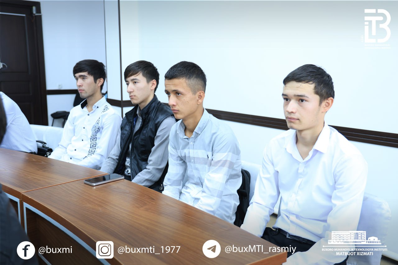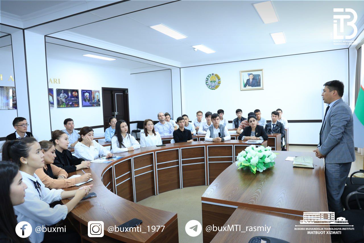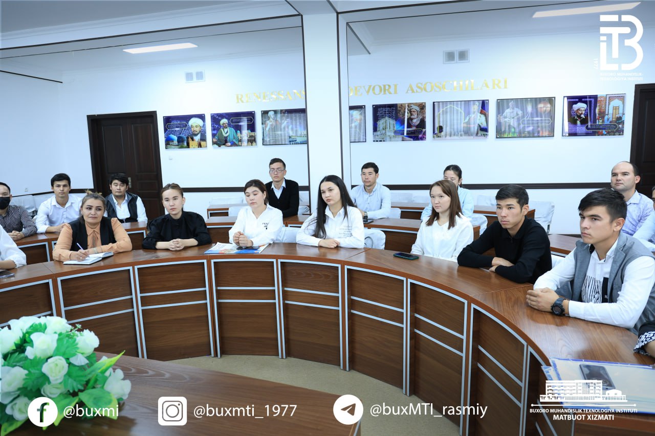 Buxoro muhandislik-texnologiya instituti yoshlar masalalari va ma’naviy-ma’rifiy ishlar bo‘yicha birinchi prorektor Doniyor G‘afurov hamda qoraqalpog‘istonlik talabalar o‘rtasida uchrashuv tashkil etildi.