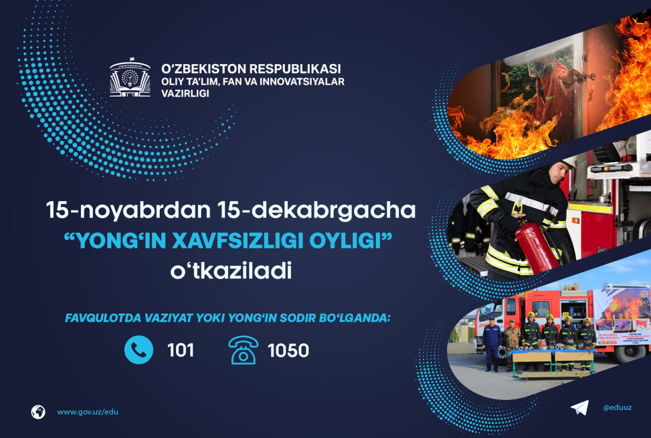 2024-yil 15-noyabrdan 15-dekabrga qadar yurtimizda “Yong‘in xavfsizligi oyligi” o‘tkaziladi. Oliy ta’lim, fan va innovatsiyalar vazirligi barchani ushbu muhim tadbirda faol ishtirok etishini so‘raydi.