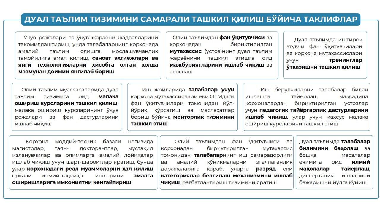 Oliy ta’lim tizimi ham so‘nggi yillarda jahon standartlariga mos kadrlar tayyorlash uchun tariximizga nazar solib, buyuk mutafakkir va allomalarimiz tajribasini yangi avlodga o‘rgatib kelmoqda. Shunday tajribalardan biri ustoz-shogird an’analarini qadriyat darajasiga ko‘tarish, uni dual ta’limda qo‘llash jarayonidir. Aslida biz uchun bugungi kunda “yangicha” deb qabul qilinayotgan dual ta’lim tarixi XIV asrlarga borib taqaladi hamda ustoz-shogird munosabatlari asrlar davomida ajdodlarimiz namunasida bizgacha yetib kelmoqda.