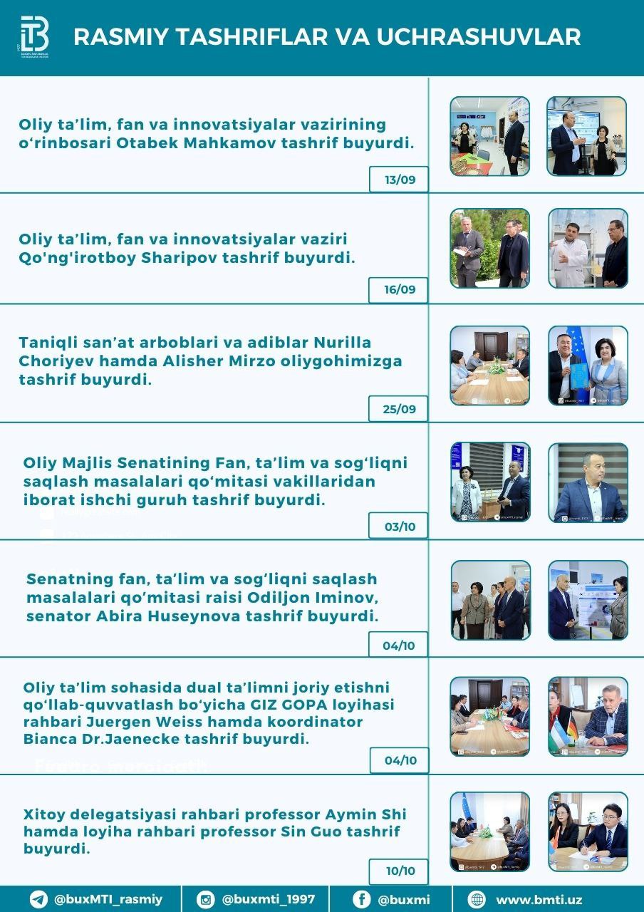 ❮ ❯ Buxoro muhandislik-texnologiya instituti tomonidan 2024-yil (sentyabr-oktyabr) oylari davomida amalga oshirilgan ishlar Share this post on: By: Admin Category: Yangiliklar View: 127