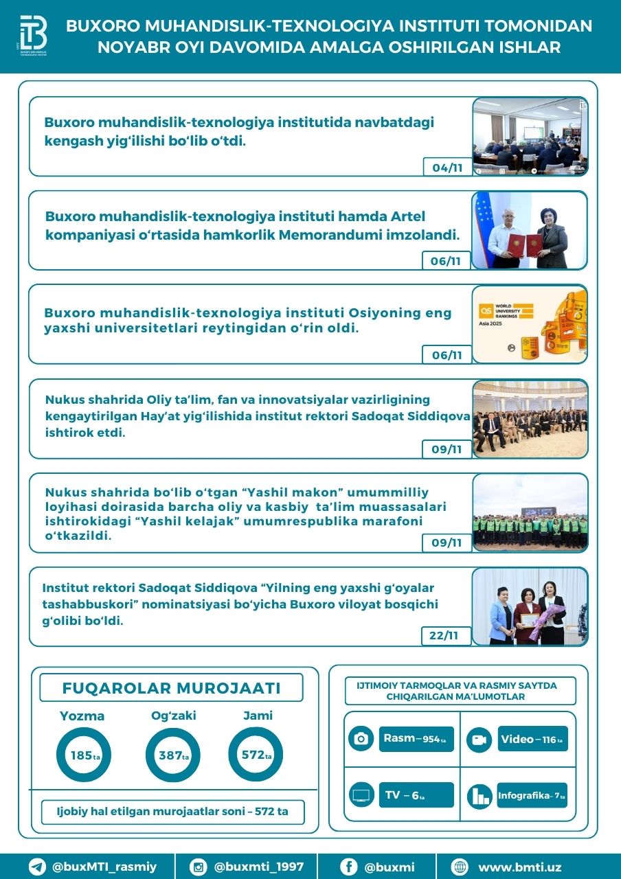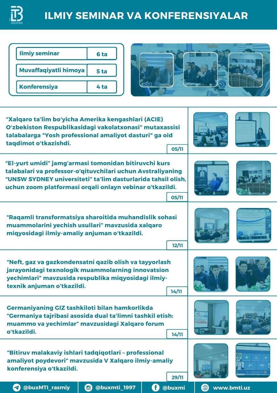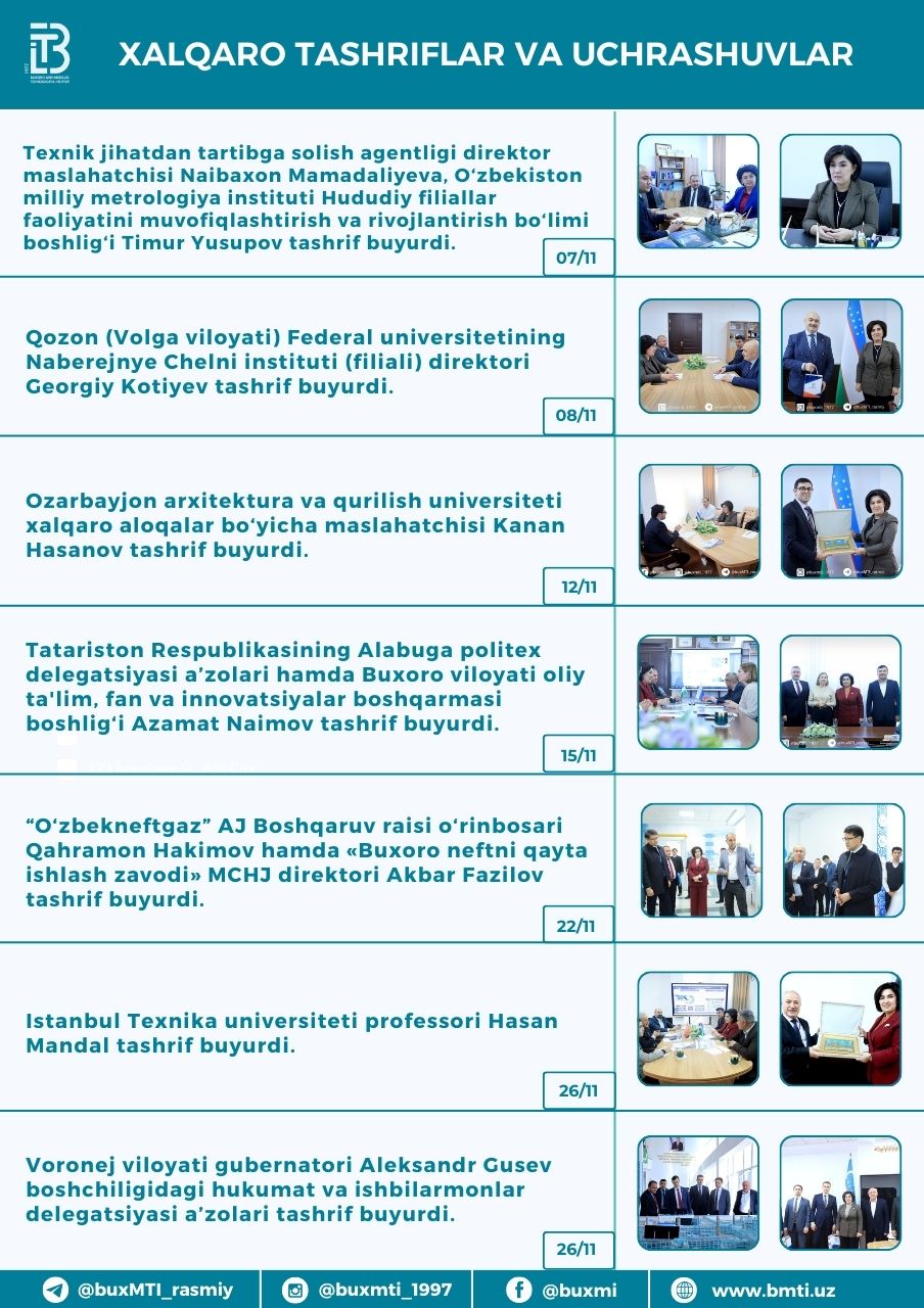 ❮ ❯ Buxoro muhandislik-texnologiya instituti tomonidan 2024-yil noyabr oyi davomida amalga oshirilgan ishlar Share this post on: By: Admin Category: Yangiliklar View: 227