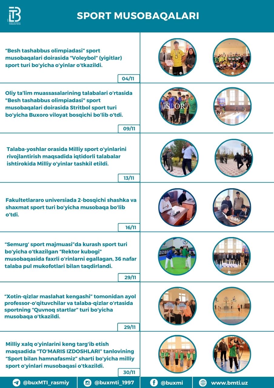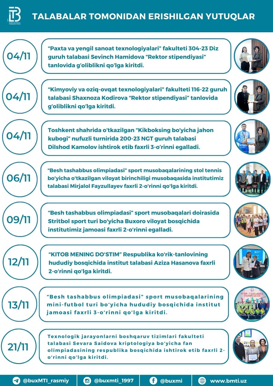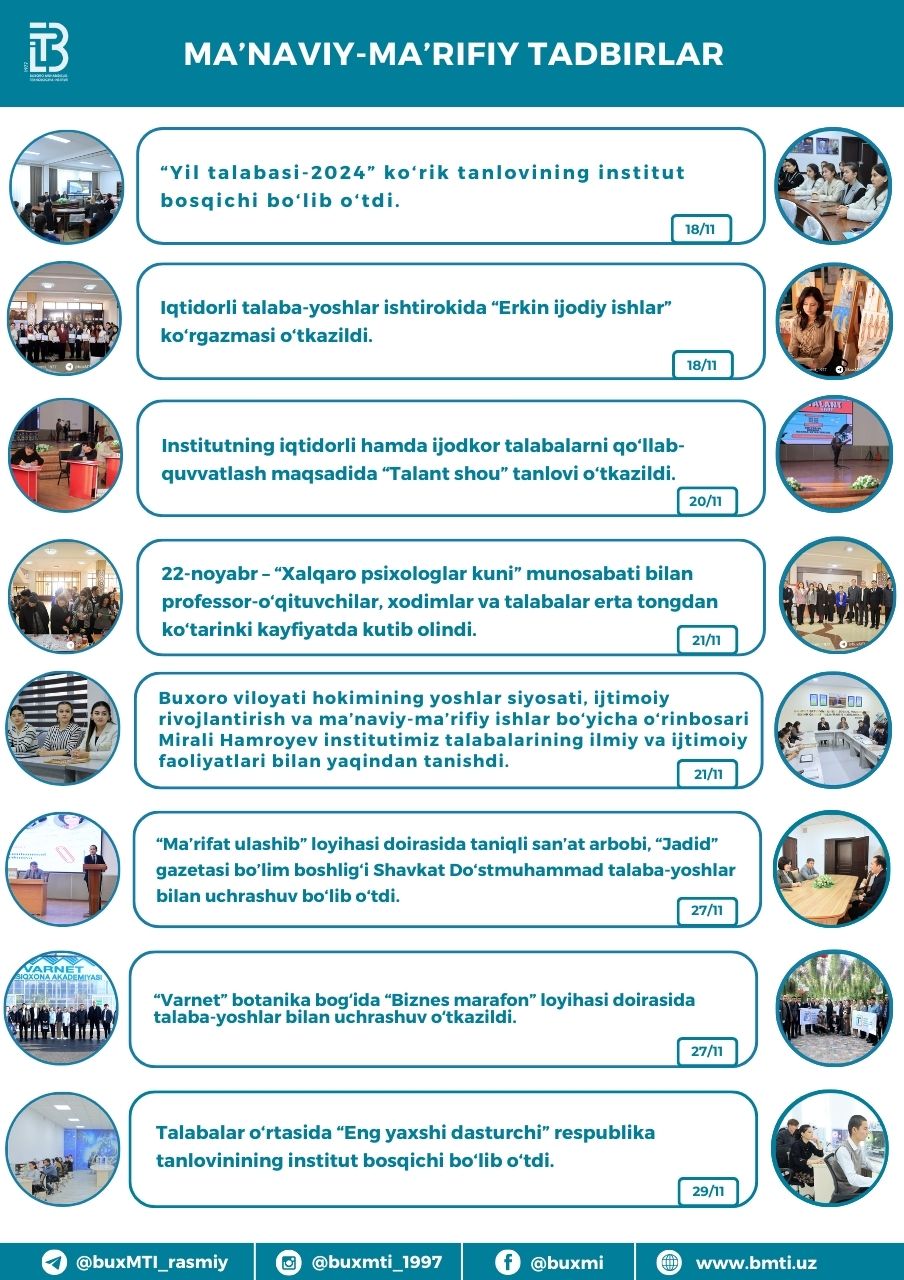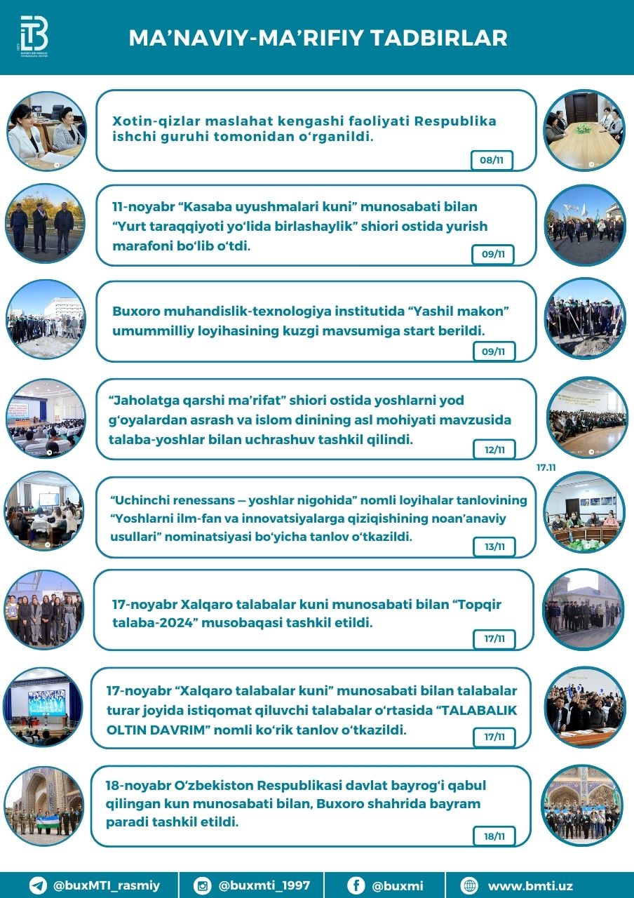 ❮ ❯ Buxoro muhandislik-texnologiya instituti tomonidan 2024-yil noyabr oyi davomida amalga oshirilgan ishlar Share this post on: By: Admin Category: Yangiliklar View: 227