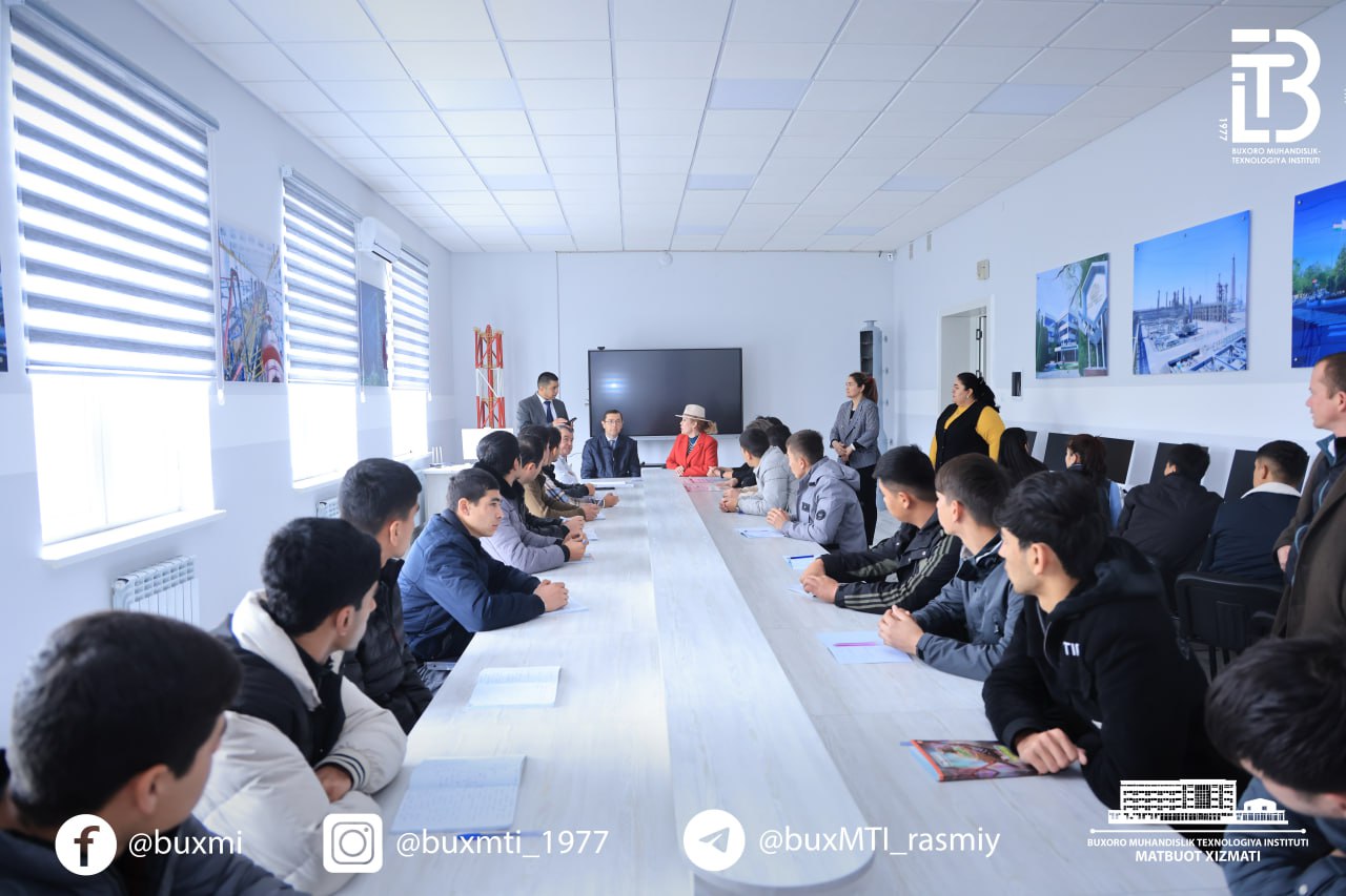 Buxoro muhandislik-texnologiya institutida M.Auezov nomidagi Janubiy Qozog‘iston universiteti professori Gauxar Turabekova tomonidan “Neft-gaz texnologiyasi” fakulteti talabalariga “Gazni qayta ishlash kimyosi va texnologiyasi” fanidan ma’ruza mashg‘uloti o‘tkazildi.