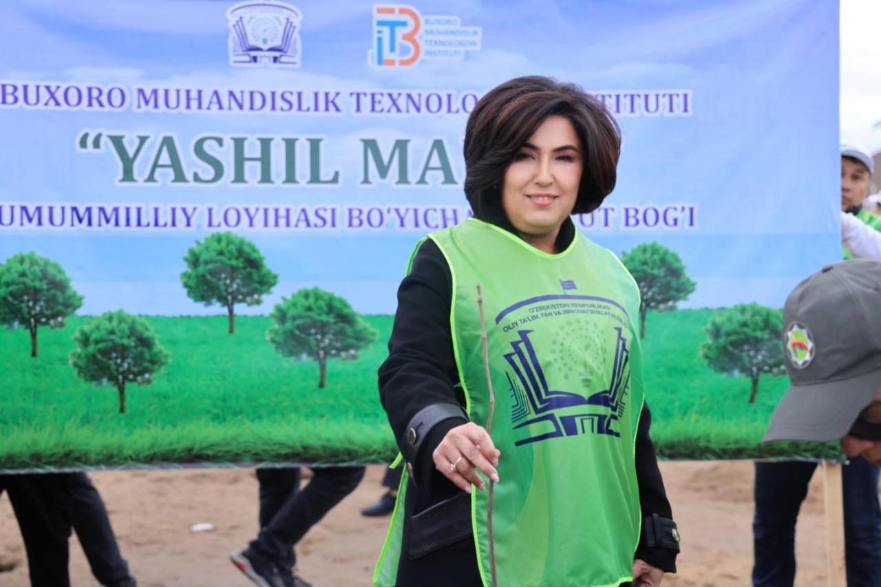 Unda Buxoro muhandislik-texnologiya instituti rektori Sadoqat Siddiqova ham ishtirok etib, ko'chat nihollarini yaxshi niyatlar bilan yerga qadadi.