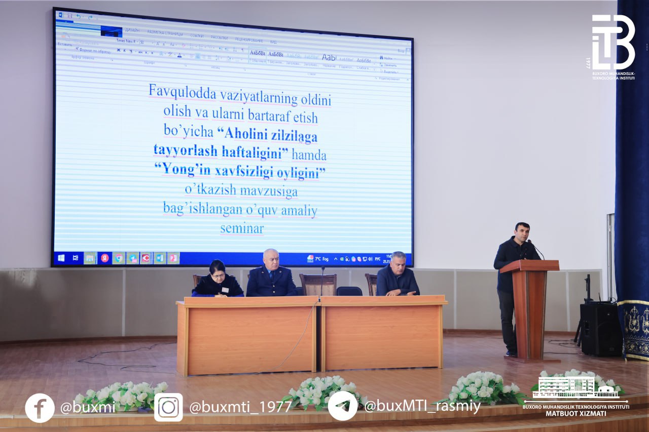 Buxoro muhandislik-texnologiya institutida favqulodda vaziyatlarning oldini olish va ularni bartaraf etish boʼyicha “Аholini zilzilaga tayyorlash haftaligini” hamda “Yongʼin xavfsizligi oyligini” oʼtkazish mavzusiga bagʼishlangan oʼquv amaliy seminar boʼlib oʼtdi.