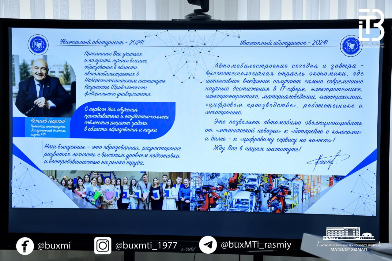 Buxoro muhandislik-texnologiya institutiga Qozon (Volga viloyati) Federal universitetining Naberejnye Chelni instituti (filiali) direktori Georgiy Kotiyev tashrif buyurdi.