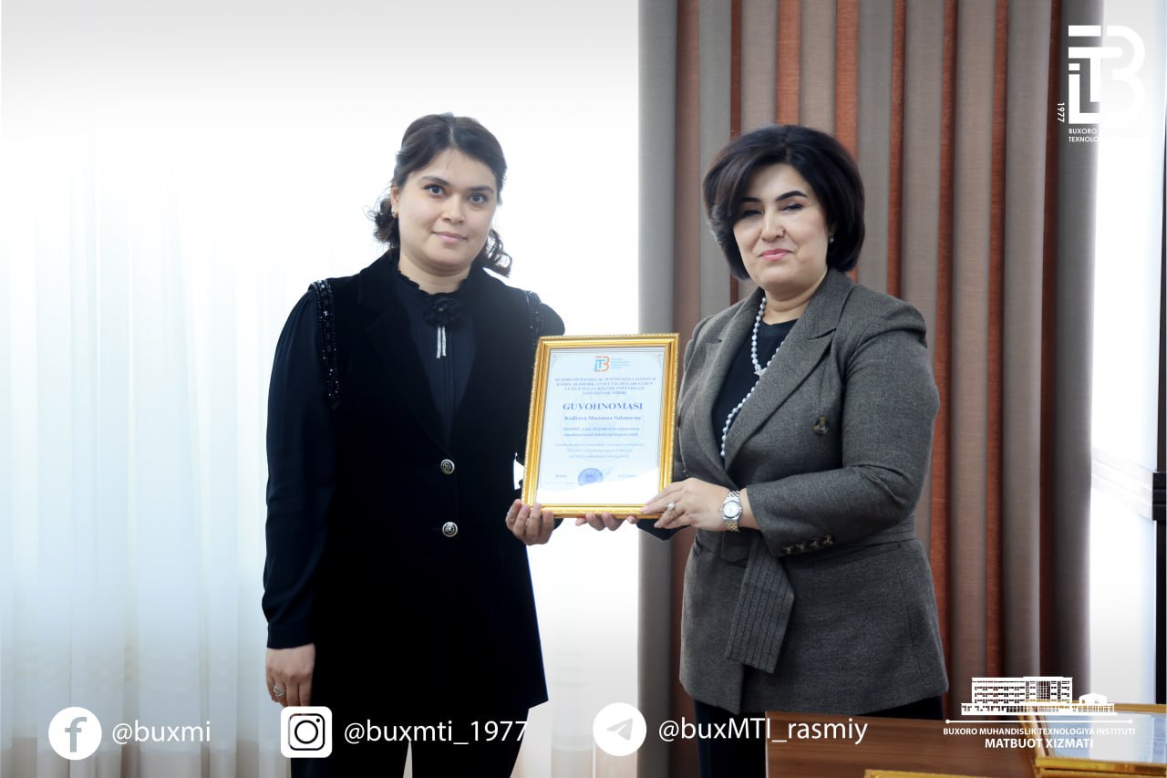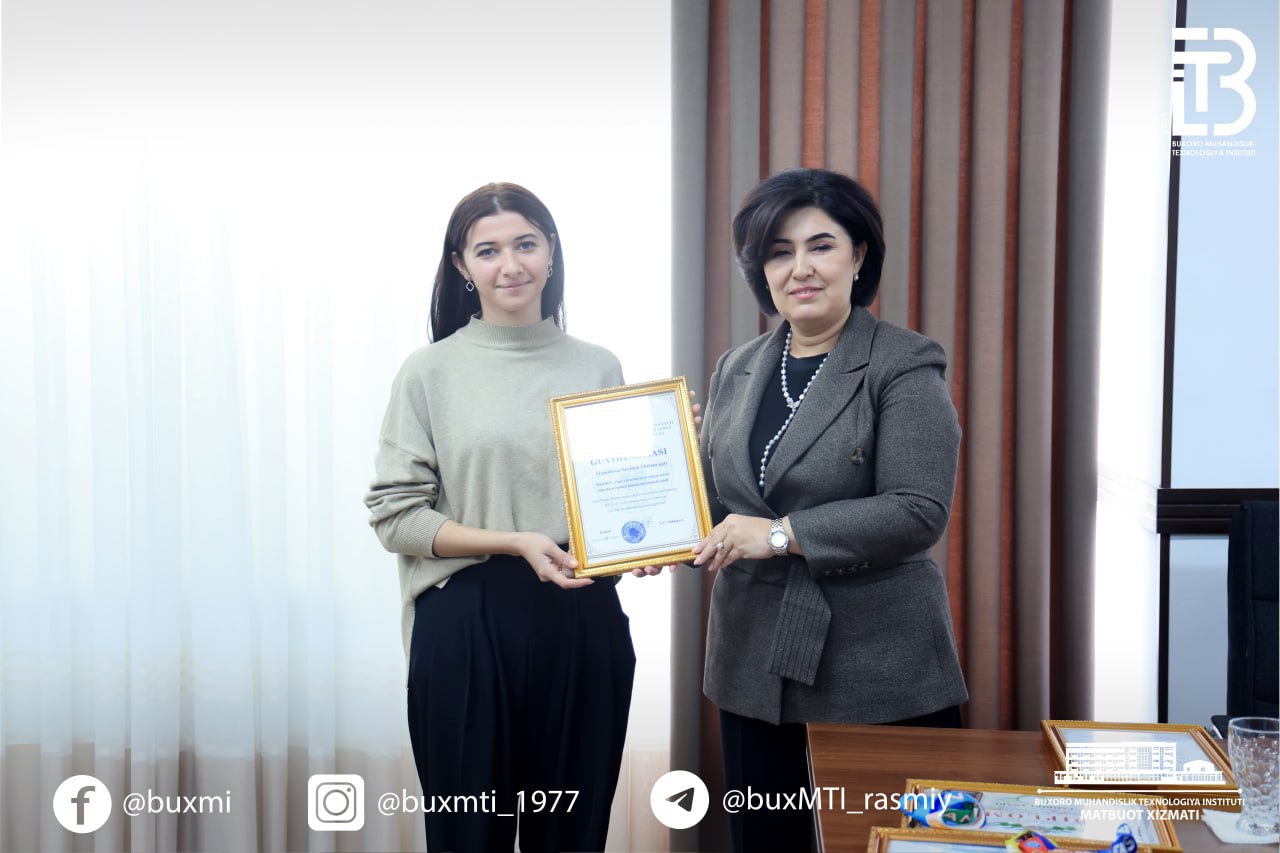 Buxoro muhandislik-texnologiya instituti jamoasi Shaxnoza Kodirovani ushbu yutuq bilan tabriklab, kelajakdagi ishlarida omad va zafarlar tilaydi!