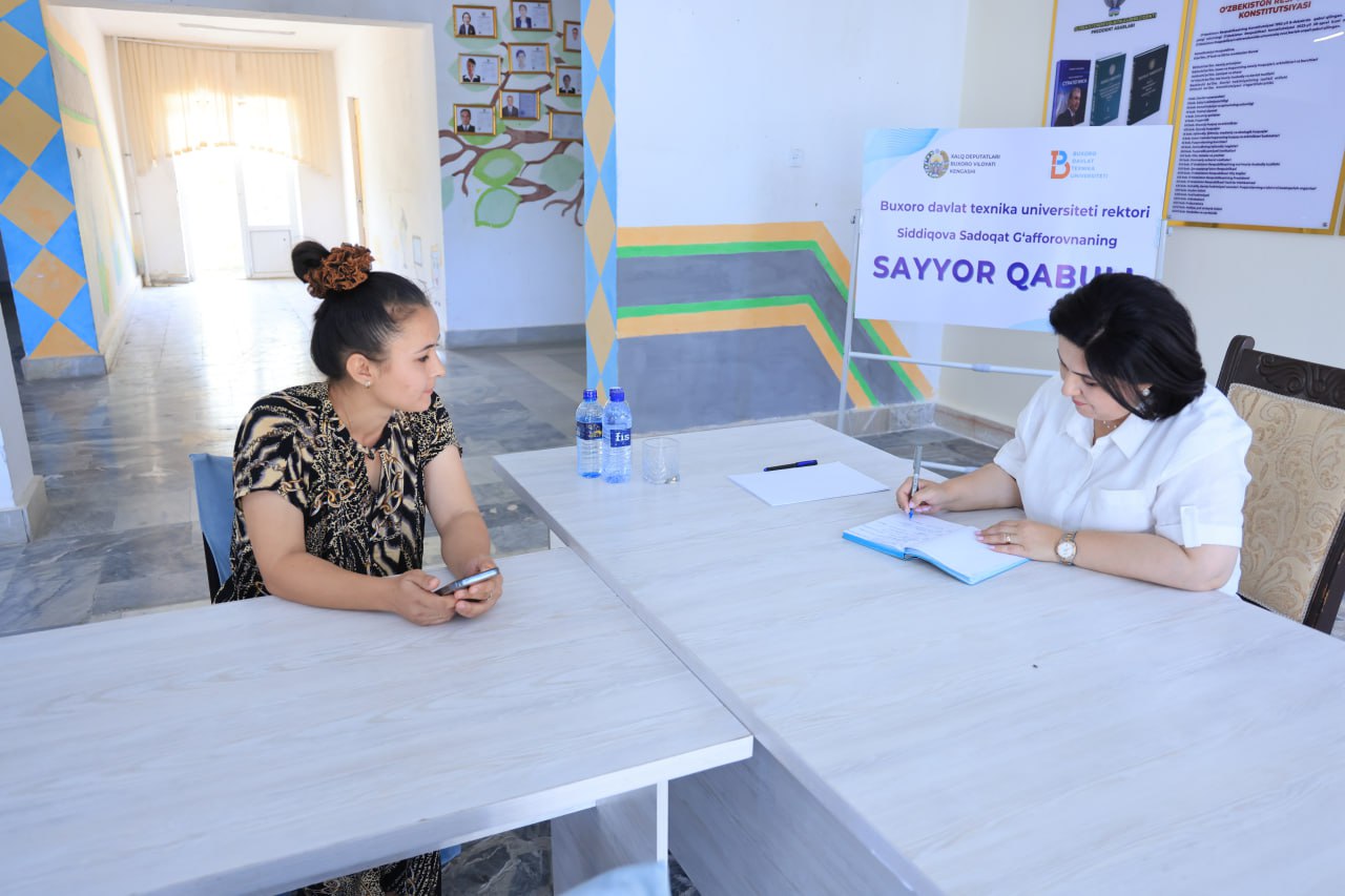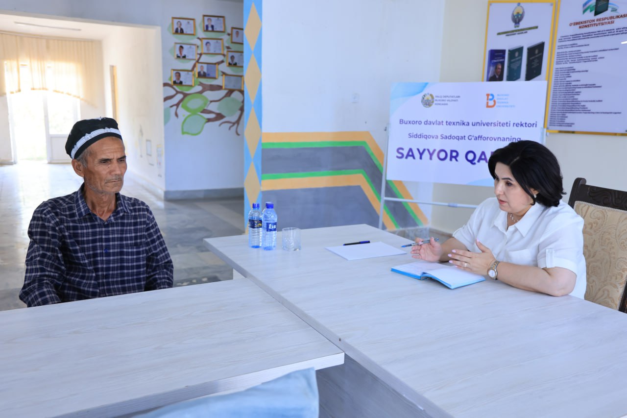 Aholi bilan ochiq va to‘g‘ridan-to‘g‘ri muloqotni yo‘lga qo‘yish, mavjud dolzarb muammolarni aniqlash hamda ularni joyida hal etish maqsadida Buxoro davlat texnika universiteti rektori, Xalq deputatlari Buxoro viloyat Kengashi deputati Sadoqat Siddiqova tomonidan sayyor qabul o‘tkazildi.