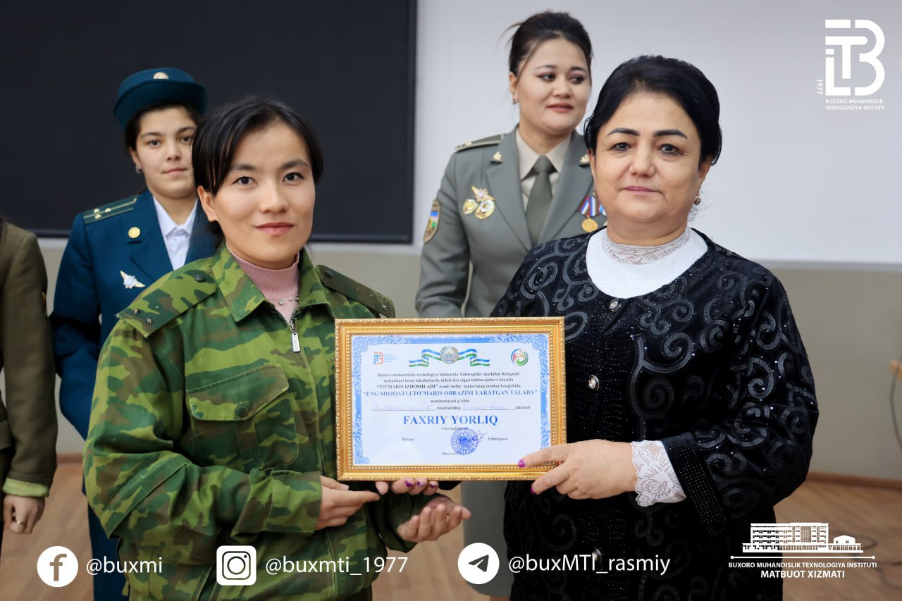 Buxoro muhandislik-texnologiya institutida xotin-qizlar maslahat Kengashi tashabbusi bilan talaba-qizlar o‘rtasida “To‘maris izdoshlari” nomli milliy tanlovning 2-bosqichi bo‘lib o‘tdi.