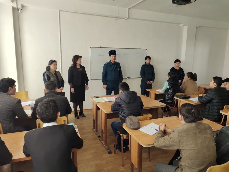 Yoshlar o‘rtasida huquqbuzarlik va jinoyatchiliklarni oldini olish masalasi bugungi kunda yoshlarga oid davlat siyosatining dolzarb yo‘nalishlaridan biridir. Shu ma'noda mamlakatda huquqni muhofaza qiluvchi organlar, vazirlik va idoralar bilan birga jamoatchilik vakillari tomonidan yoshlarning siyosiy faolligini oshirish, huquqiy ongi va madaniyatini rivojlantirish hamda yoshlar o‘rtasida jinoyatchilikni oldini olish borasida 2022 yil 25 noyabr kuni BMTI TJBT fakulteti “Menejment” kafedrasi professor-o’qituvchilari Zayavitdinova N.M., Xudoyberdiyeva O.Q., Bozorova M.S., Primova Sh.J., Raxmatov J.A. hamda BMTI profilaktik nozirlari U.M.Bo’riyev, E.E. Sanoyeva tomonlaridan talaba yoshlar bilan suhbat o’tkazildi.