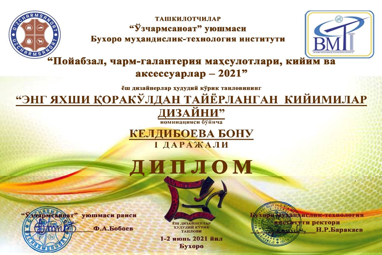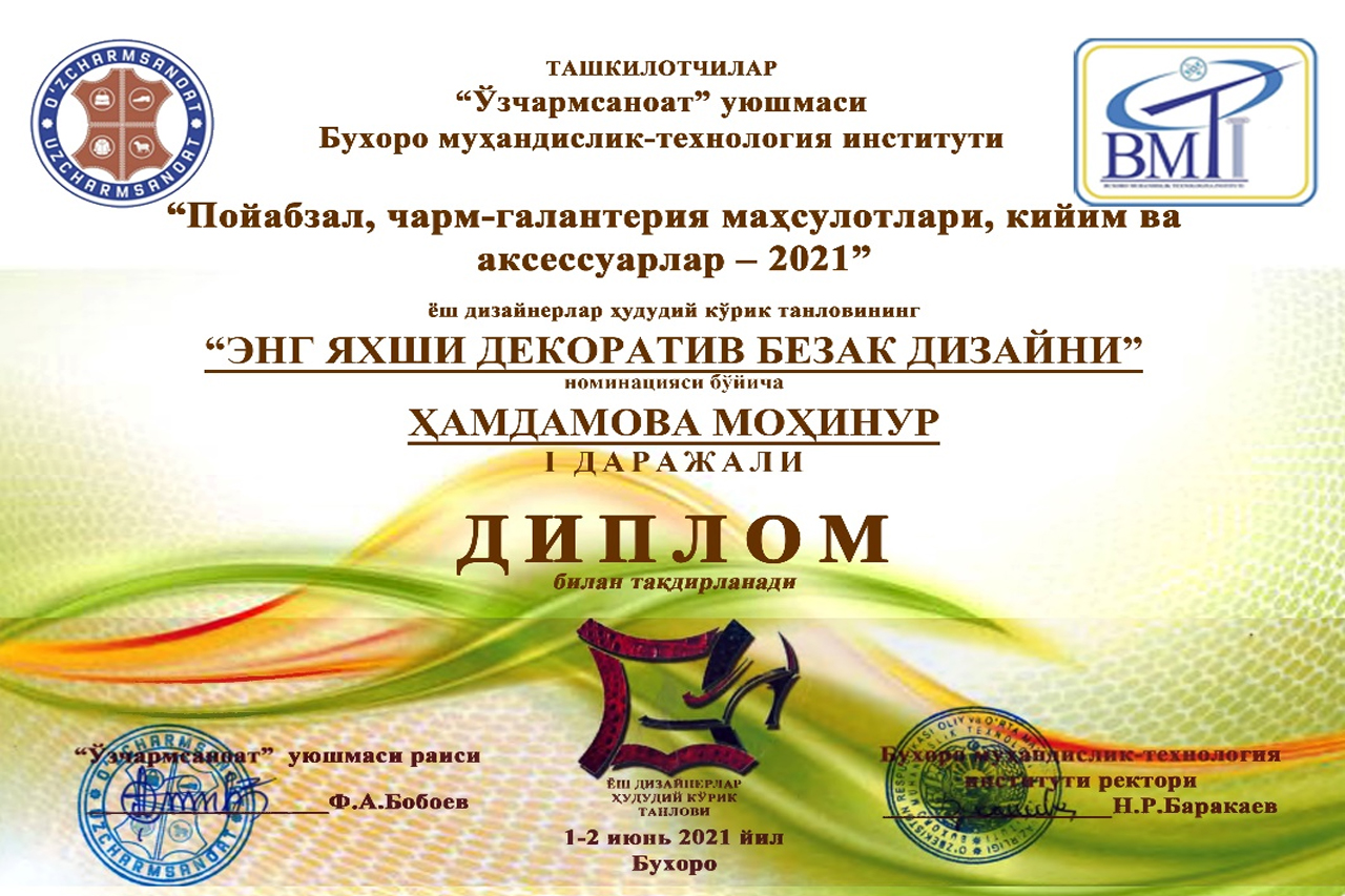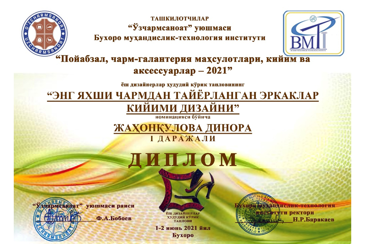 Buxoro muxandislik-texnologiya instituti “Charm buyumlari texnologiyasi va dizayni” kafedrasi Rosiya Federatsiyasi Sankt-Peterburg Davlat Sanoat texnologiyasi va dizayn universiteti hamda А.N.Kosigin nomidagi Rossiya Davlat Universitetlari bilan 2020 yilda imzolangan “Oʼzaro hamkorlik memorandumi” asosida uzviy aloqada oʼquv-uslubiy, ilmiy-tadqiqot yoʼnalishlarida hamkorlik ishlarini olib bormoqda.