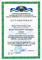 ![]() | В 2020-2021 учебном году одарённый студент Юсупов Юсуф под руководством доцента Хасановой Г.Дж.был удостоен “Государственной стипендии имени Ислама Каримова”. |