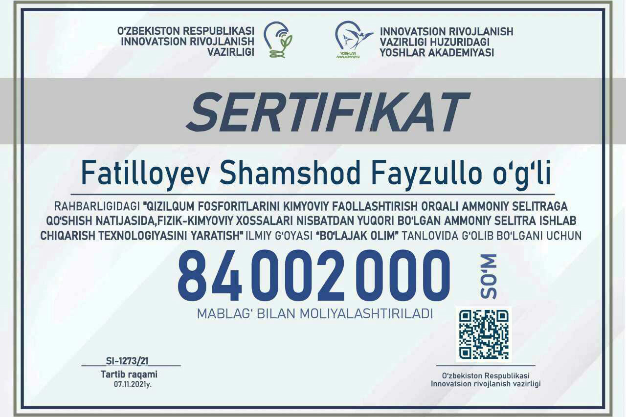Мастер 2 ступени Фатиллоев Шамшод принял участие в конкурсе молодых ученых Республики «Будущий ученый» и выиграл почти 100 миллионов долларов. награжден государственной сумовой стипендией и соответствующим дипломом. Кроме того, двое наших магистров Шукруллаев Джавахир и Ниязов Сабир прошли научную стажировку в Южно-Казахстанском государственном университете на основе программы взаимного академического обмена и получили соответствующие сертификаты. Также повышается качество и эффективность учебного процесса за счет доставки виртуальной лаборатории, печатной литературы и программного обеспечения для учебно-методической поддержки повышения профессиональной компетентности будущих инженеров.