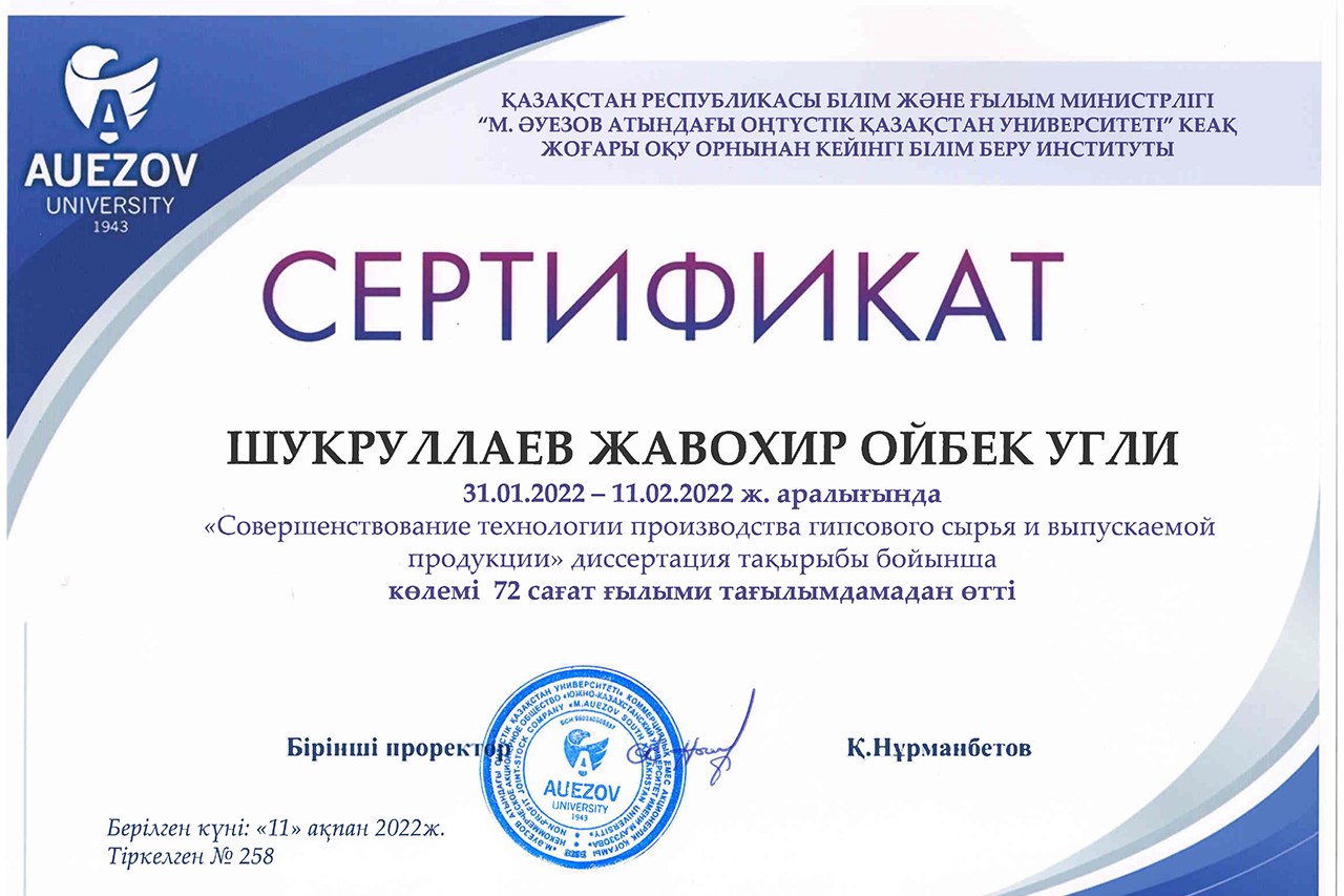 На сегодняшний день существуют отношения сотрудничества с 2 зарубежными вузами, входящими в ТОП 500-1000 мировых рейтингов, в том числе: Южно-Казахстанским университетом им. М. Ауэзова и Московским государственным университетом им. М. Ломоносова. Профессор Сейтмагзимова Галина Мануйловна, заведующая кафедрой «Химическая технология неорганических веществ» Южно-Казахстанского государственного университета им. М. Ауэзова 22-27 ноября 2021 г. за счет средств фонда соотведения на 2021-2022 учебный год кафедры «Химическая технология неорганических веществ» 60710100 - Химическая технология (неорганические вещества), 60710100 - Химическая технология (силикатные материалы) и 5А320401 - Химическая технология (Химическая технология неорганических веществ) и 5А320401 - Химическая технология (Технология силикатных и труднообрабатываемых материалов). -стеклоплавильных материалов) выпускник специальности по предмету «Общая химическая технология» Прошел лекционные и практические занятия.