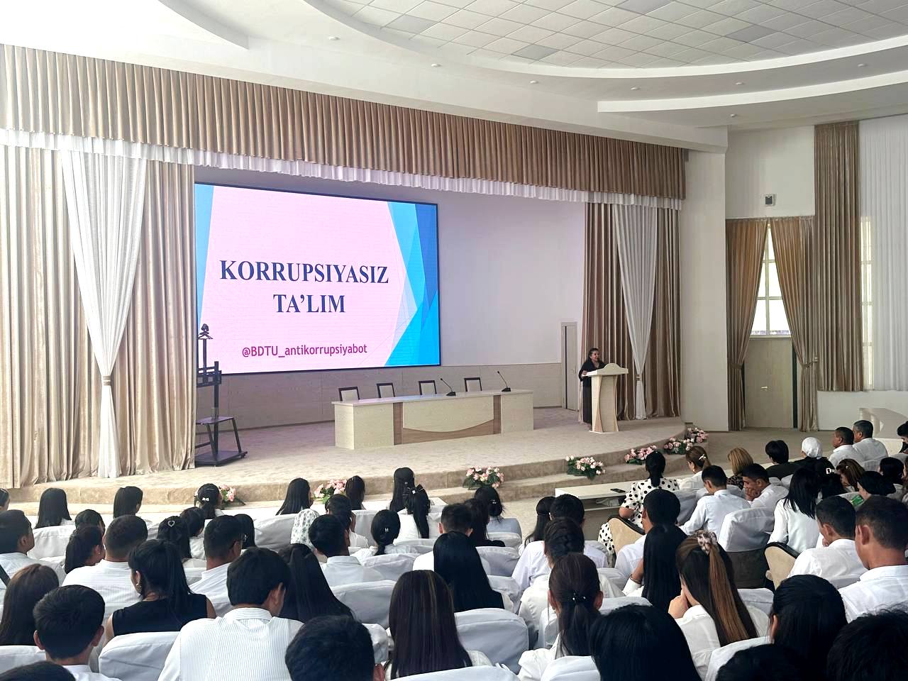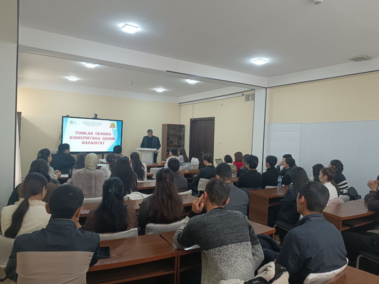 Universitetda “Yoshlar orasida korrupsiyaga qarshi madaniyat” mavzusida targ‘ibot tadbiri tashkil etildi. Tadbirda Korrupsiyaga qarshi kurashish “Komplayens nazorat” tizimini boshqarish bo‘limi boshlig‘i Sherali Zayniyev korrupsiyaning jamiyat taraqqiyotiga salbiy ta’siri haqida ma’ruza qildi.